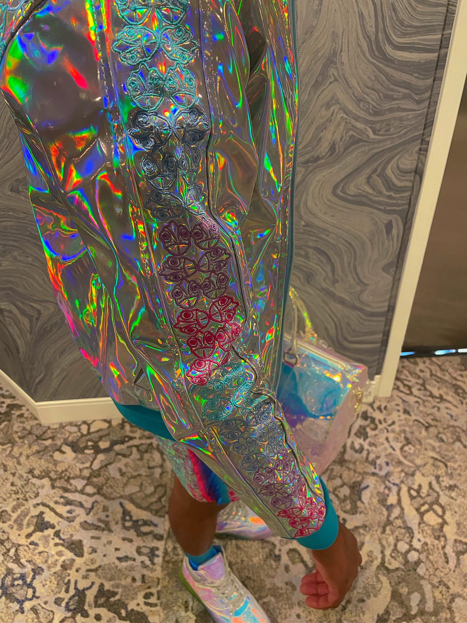 Rare Air Suit Jacket, Made Of Special Hand Made Iridescent Leather. Hand Crafted Stitch Work Down Arm Seams And Back Panel. Zipper Pockets and Cuff Trimming. Capable Of Changing 14 Different Colors in Differnt Light Environments. Iconic Chameleon Monogram Pattern Featured On Jackets At Arm and Back. Own 1 Of Only 20 Made Worldwide.