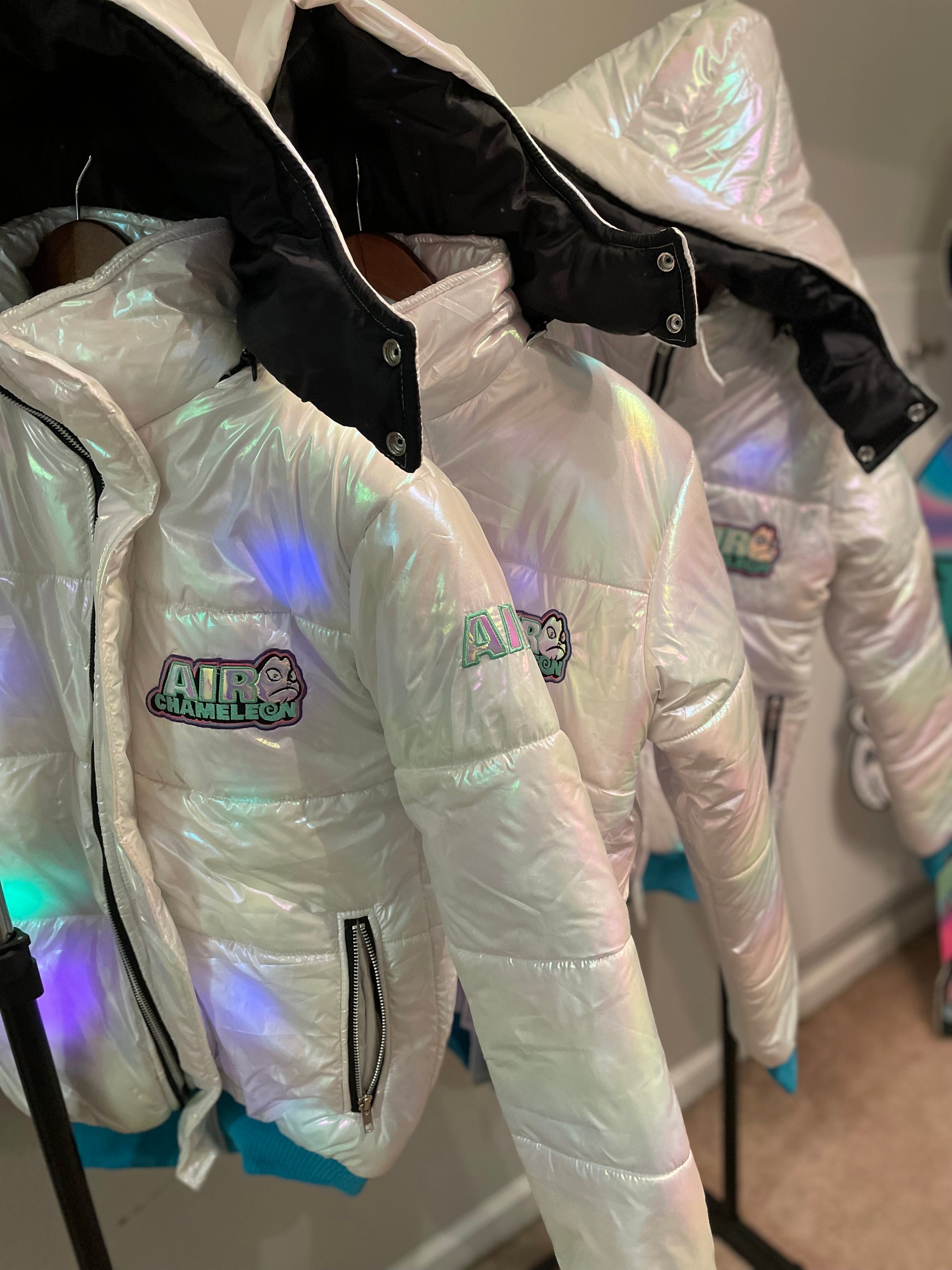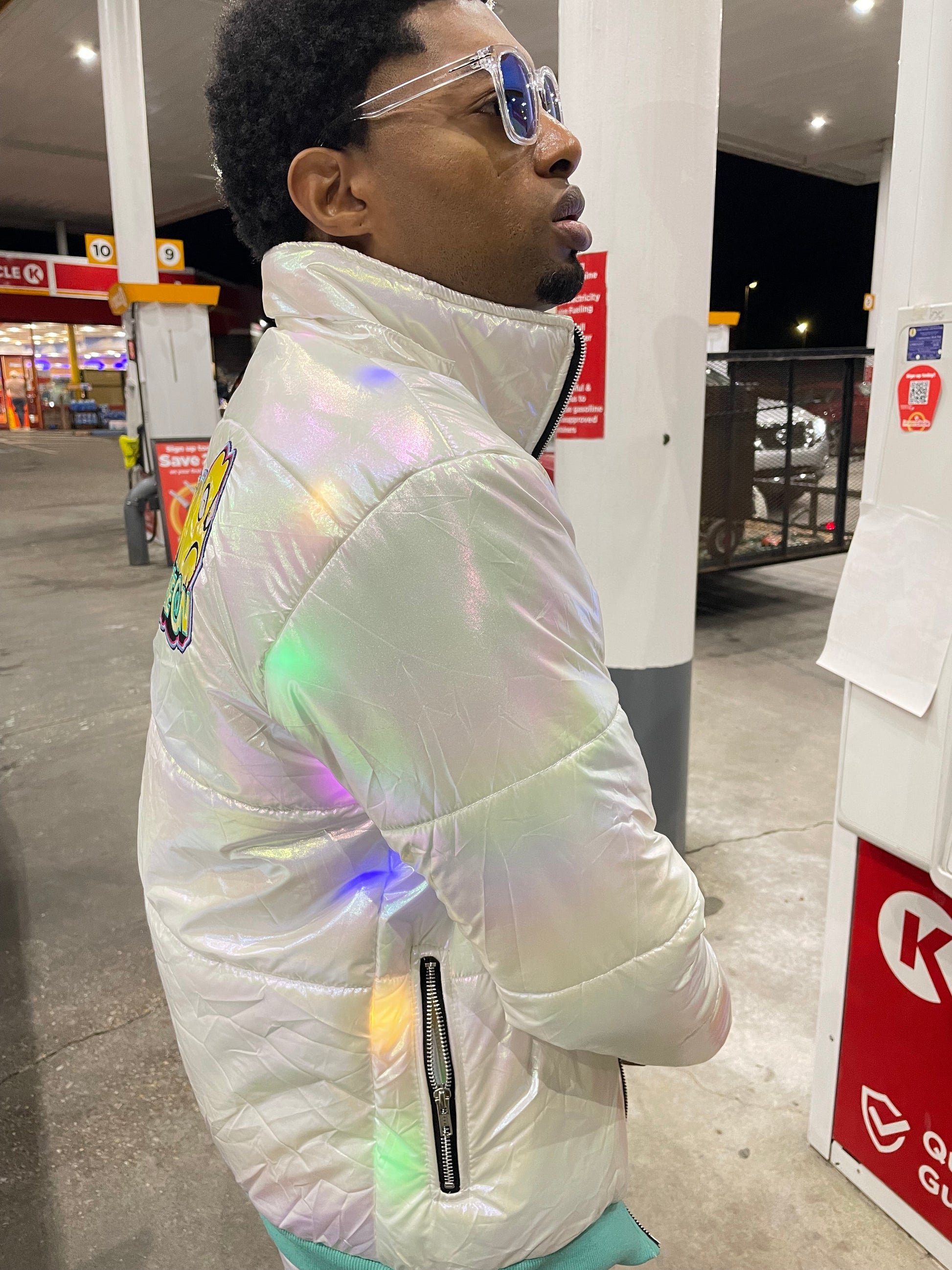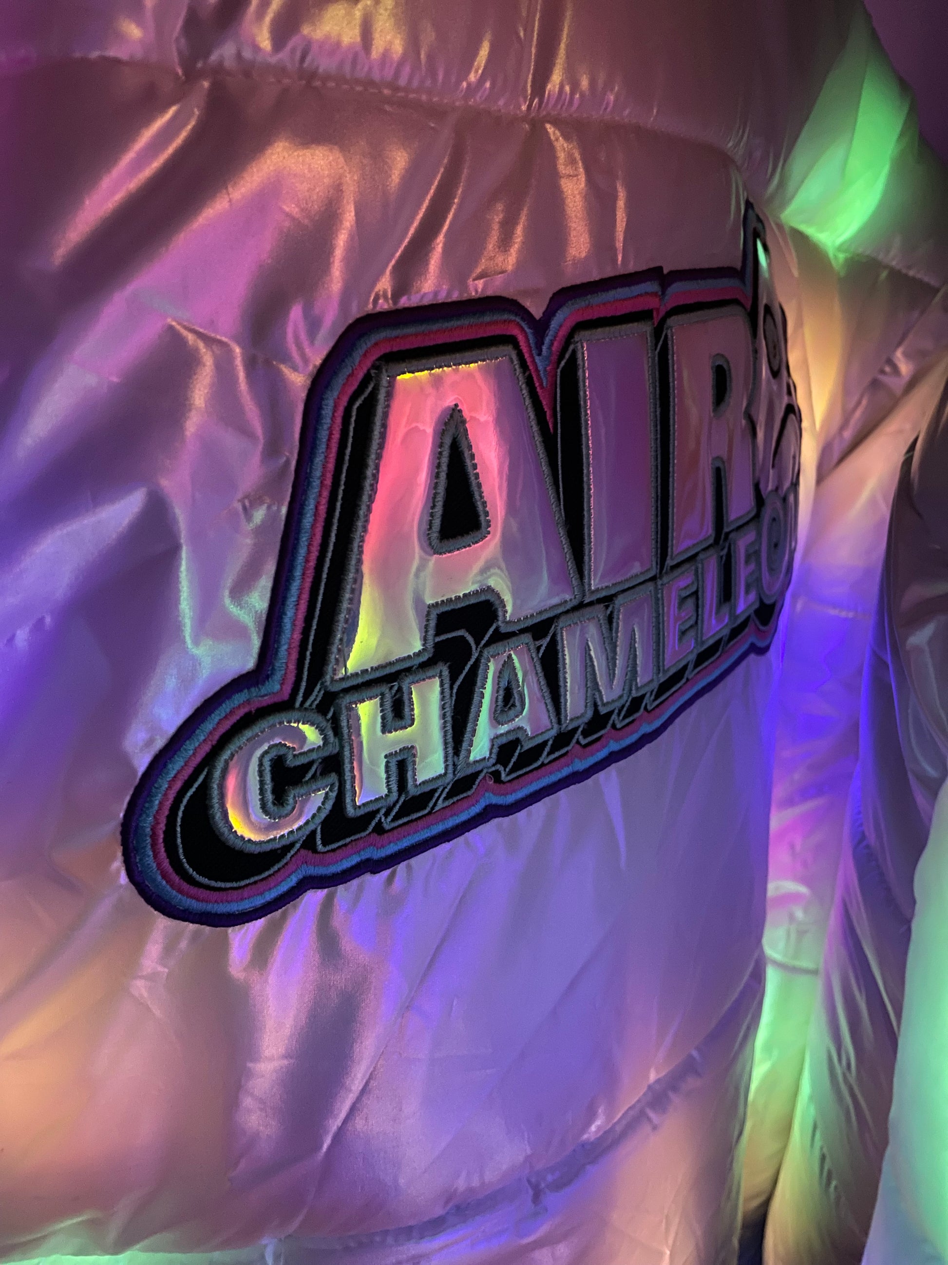 UFO Bubble Jacket By Air Chameleon. Exclusively Developed For Astronauts Of Designer Wear. Delicate Iridescent Color-Rotating Bubble Jacket During The Day; And Light Up The Night’s Atmosphere With Engineered Lighting Throughout The Jacket Panels. Commemorating 20 Years Of Legendary Releases.